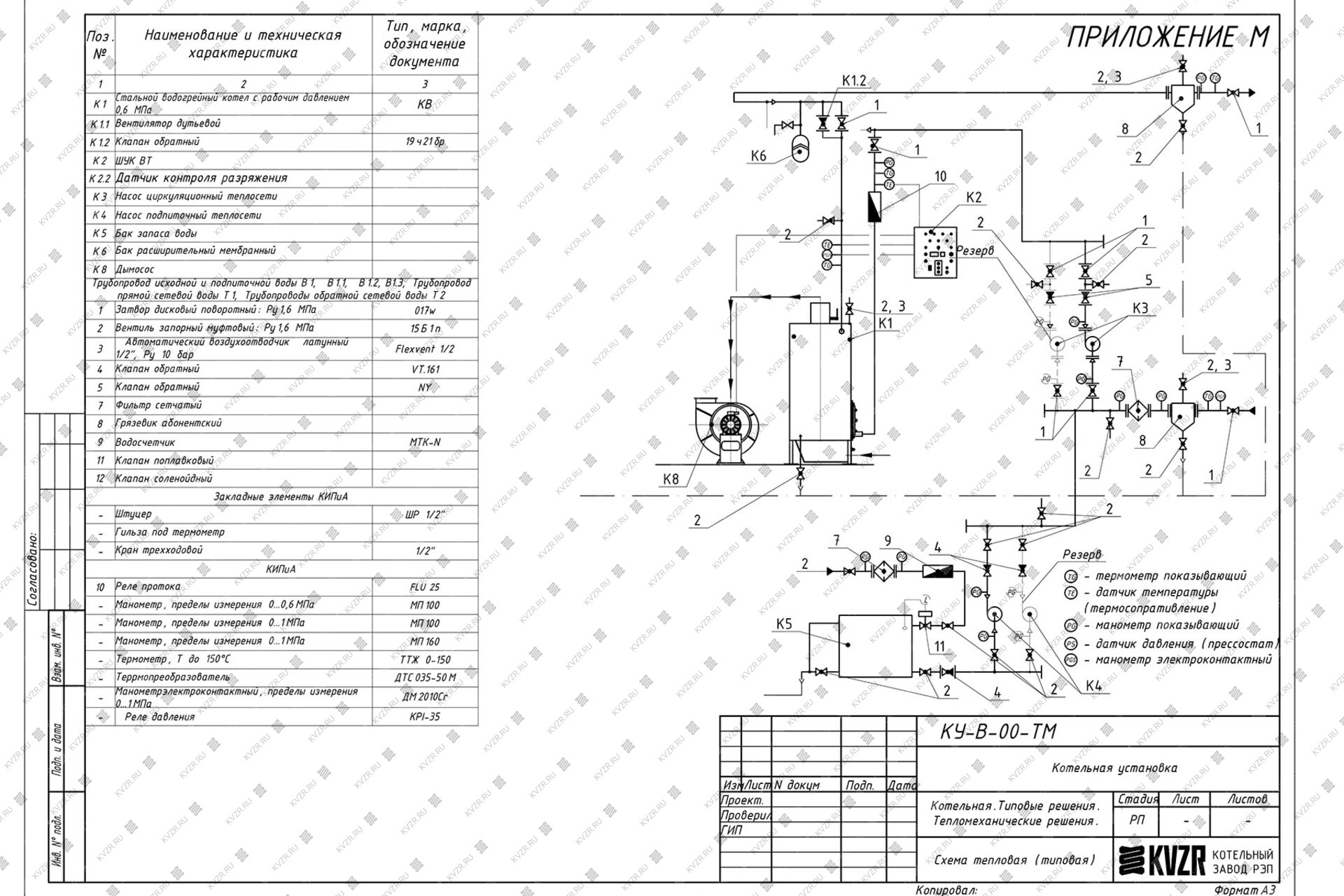 Образец тепловой схемы подключения котла 0.3 МВт уголь дрова и вспомогательного оборудования в котельной приведен на данной схеме. При эксплуатации очень важно грамотно осуществить подключение оборудования, установить все контрольно измерительные приборы, для контроля параметров работы котельной и запорную арматуру для оперативного переключения потока теплоносителя при плановой или аварийной остановке оборудования. Данную схему можно использовать как пример для разработки под свой объект или заказать у нас разработку индивидуальной схемы для вашей котельной.