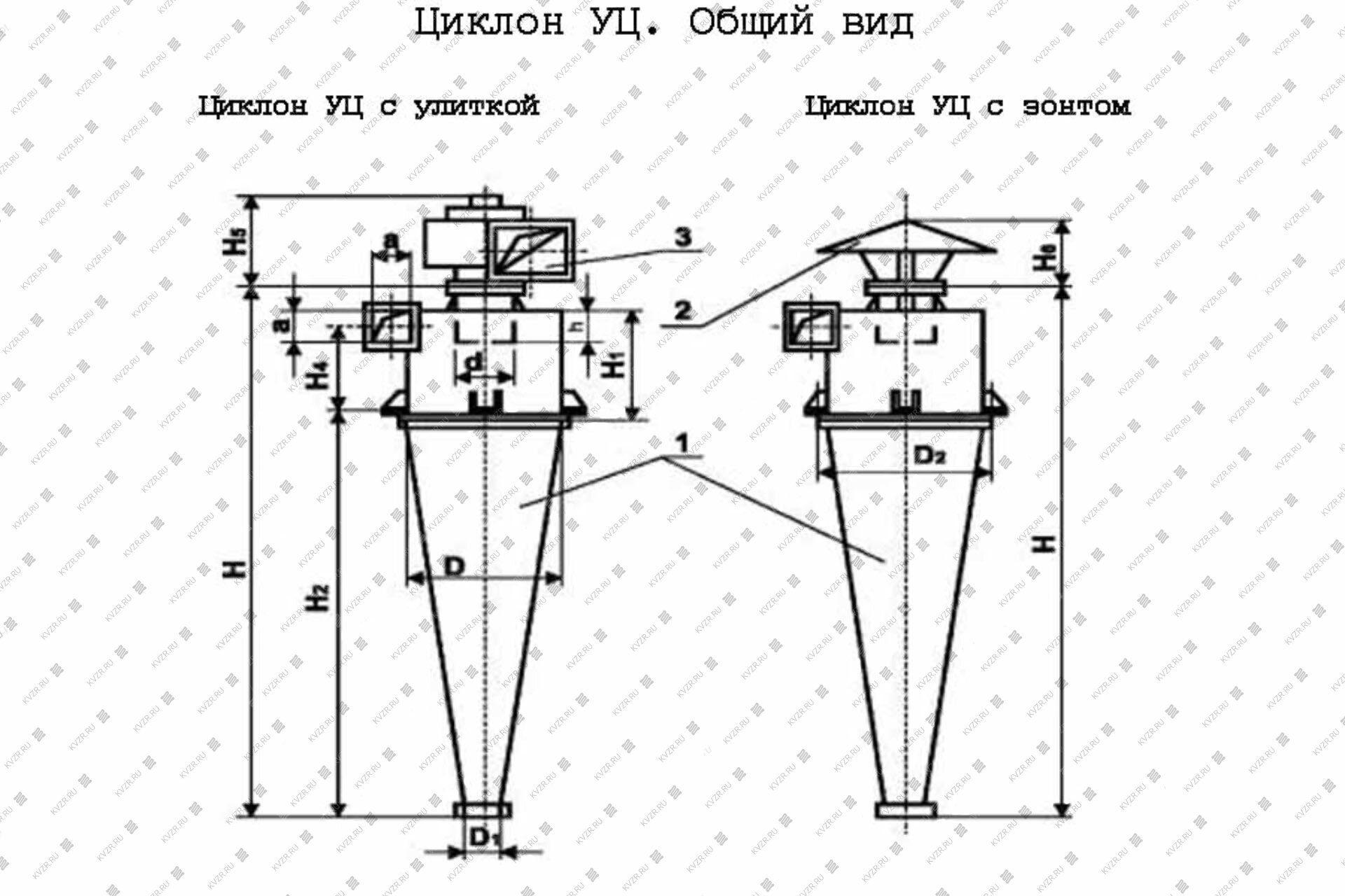 Конструктивными особенностями пылеуловителя УЦ 1000 является увеличенный диаметр средней части корпуса и длина конического нижнего сегмента. Внутри корпуса проходит вертикальная стальная труба для выхода очищенного воздуха, которая внутри снабжена спиралевидным патрубком или зонтом. В верхней части корпуса располагается входной патрубок, который своей спиральной формой задает направление вращения запыленному потоку воздуха. Нижняя конусная часть корпуса снабжена фланцем для соединения с пылесборным бункером.