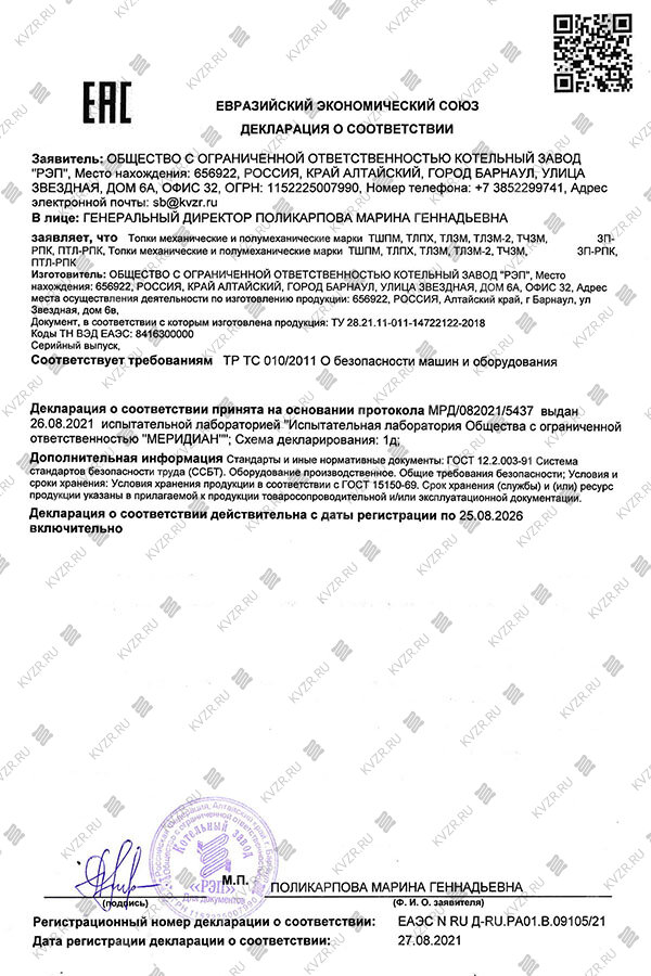 Котельным заводом получена декларация о соответствии на топки механические и полумеханические марки ТШПМТЛПХТЛЗМТЛЗМ-2ТЧЗМЗП-РПКПТЛ-РПК и запасные части к ним.