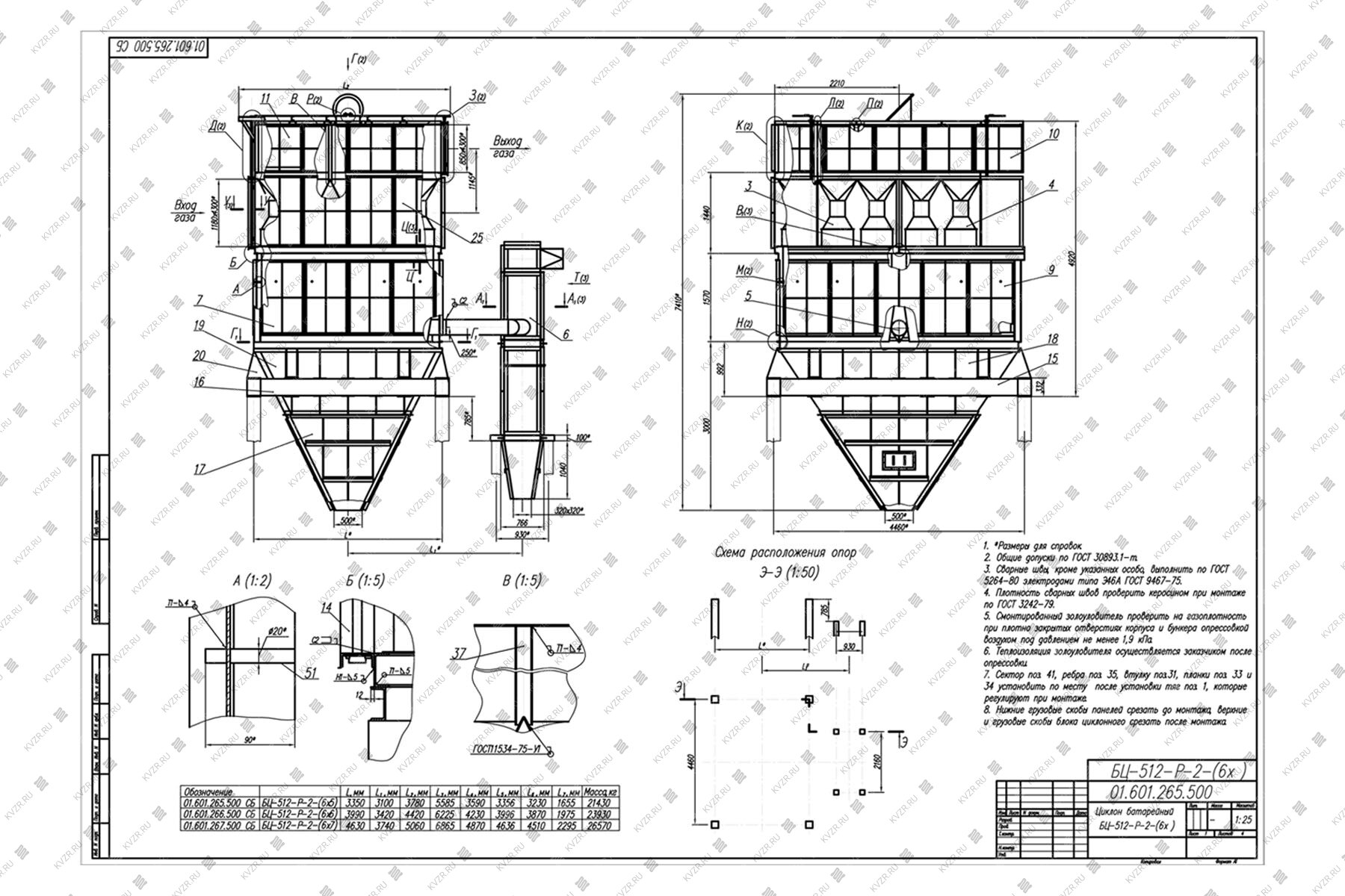 Аппараты собираются из стальных элементов диаметром 512 мм и состоят из входной и выходной камер, секций циклонных элементов, перекрытий, панелей, бункера с золоспусками, фланцев.